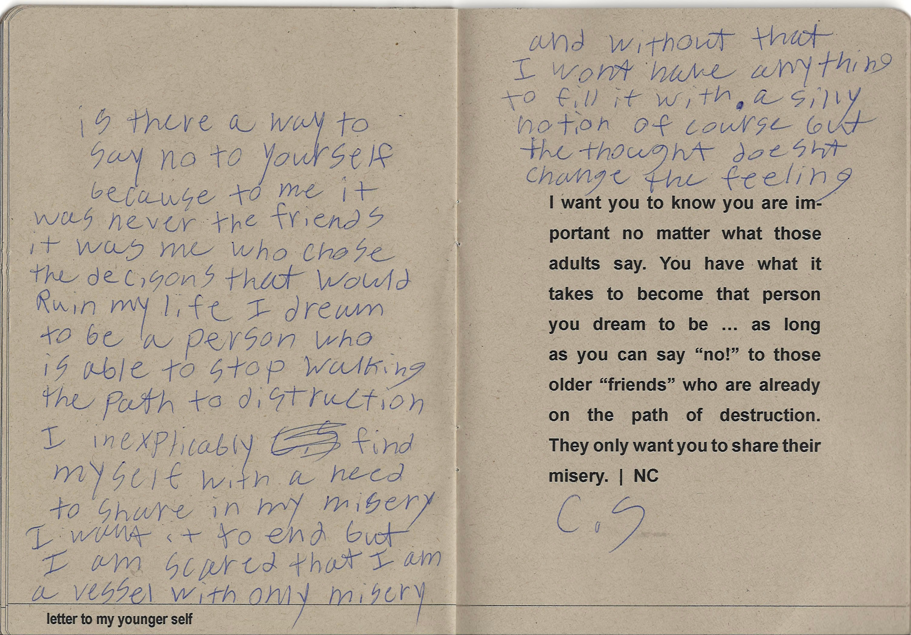 Chris wrote: “Is there a way to say no to yourself because to me it was never the friends, it was me who chose the decision that would ruin my life. I dream to be a person who is able to stop walking the path to destruction. I inexplicably find myself with a need to share in my misery. I want it to end, but I am scared that I am a vessel with only misery and without that I won’t have anything to fill it with — a silly notion, of course, but the thought doesn’t change the feeling.”